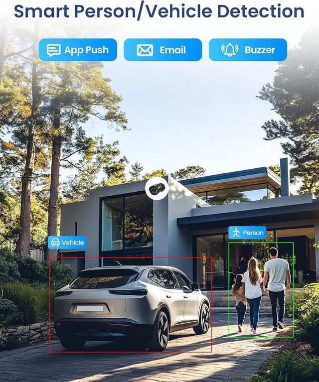 (1). [ Smart AI Motion Detection with Instant Alerts ] __ Benefit from advanced AI technology that accurately detects human and vehicle movements. Customize motion detection zones for each camera to reduce false alarms from environmental factors, and easily mask private areas from view. Receive real-time notifications and email alerts with snapshots when motion is detected, ensuring immediate awareness and swift action.