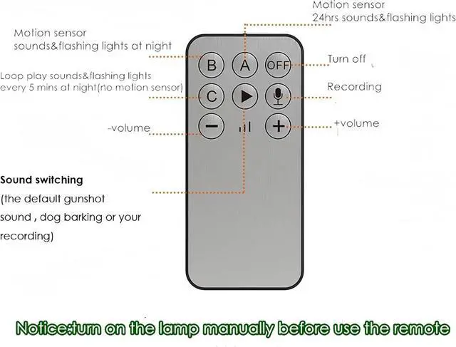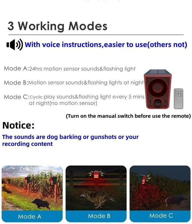[You decide how it works-3 modes,set via manual switch or remote] Mode 1:24hrs dog barking or gunshot sound or the recording content with flashing lights ,Mode 2:motion sensor dog barking or gunshot or the recording content with flashing lights at night,Mode 3:cyclic play dog barking or gunshot or the recording content with flashing lights every 5 mins at night (without motion sensor),Notice:turn on manually before using the remote