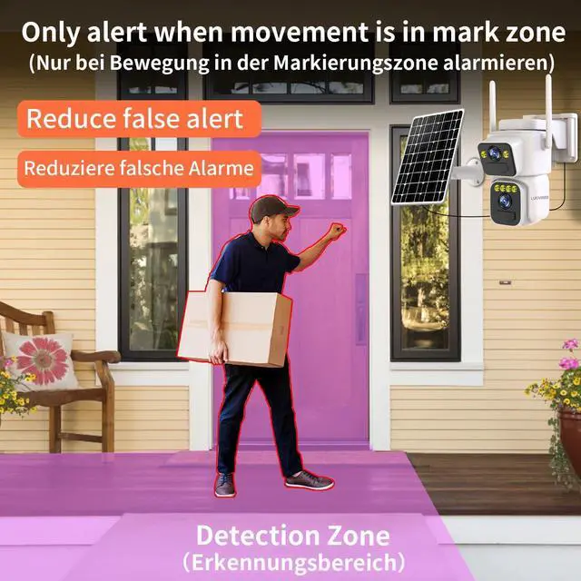 1 Device = 2 Cameras,2*2K Ultra HD Resolution & Color Night VisionSecurity Cameras Wireless Outdoor has two lens. 2 lens view cover 360°,Each lens is 3MP/2K with sharper colors and details, allowing you to see everything that is happening within your surveillance area. One camera but function as 2. The camera is built-in 8 leds, the light could be set to motion triggle on or always on at night or close,and when the lights are on at night, extraordinary color night vision adds a glow to every dark night.