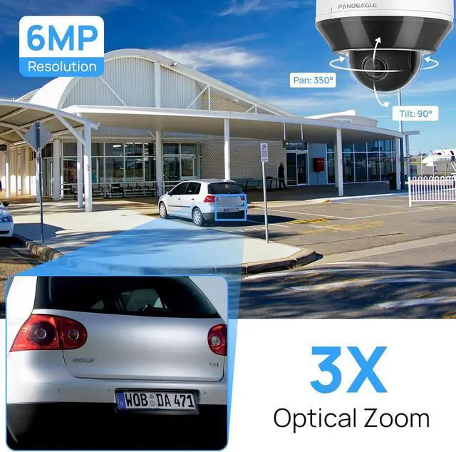 3X Optical zoom & 350°Pan 90°Tilt PTZThis 6mp (3072x2048)@25fps HD ptz ip camera features a 2.8mm~8mm motorized AF lens which support 3X optical zoom, allowing for incredible 98ft long-distance wide-angle views.With a 0-°350° pan and 0°~90° tilt range, it ensures comprehensive coverage and no blind spots.The 1/2.8 CMOS sensor with excellent focusing technology, maintains high resolution while reducing image noise to provide high-quality video images.