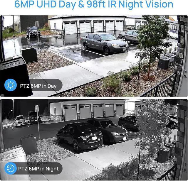 98ft IR night vision and IP66 & IK10 The 6mp security cameras features low-light technology that delivers clear video even in dimly lit nights, allows for up to 98ft IR night vision and the night IR fill light is discreet enough to be used in any situation. In addition, the ptz camera outdoor is equipped with IP66 waterproof and IK10 vandal-resistant dome, designed to withstand storms and rain to ensure your surveillance camera works properly!Protecting every aspect of your safe use!