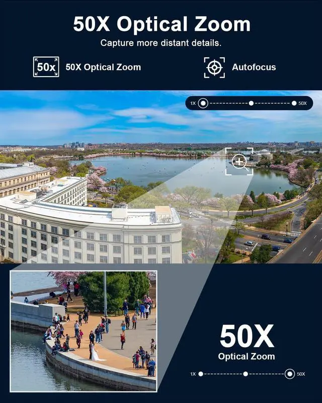 50X Optical Zoom Security Camera: Equipped with a 50x optical zoom and autofocus lens, this camera allows you to observe targets at extremely long distances (e.g., ships at sea, wildlife in the forests, birds in the yard, people in the stadium, vehicles on highways, etc.) while providing precise magnification without any loss of image quality.