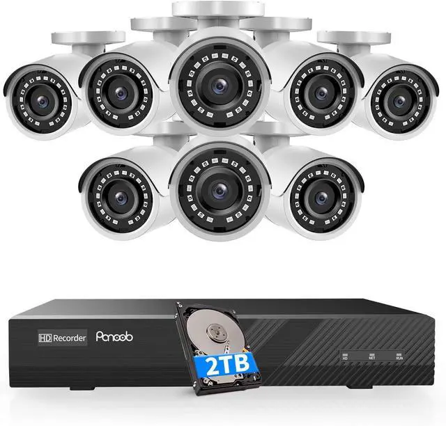 Overview: This poe security camera system includes one 4K 8 Channel POE NVR and 8x 5MP PoE cameras, one 2TB HDD built-in for storage. All cameras with 2.8mm lens around 110 degrees wide view angle, pretty and strong full-metal housing, waterproof IP67, perfect for indoor and outdoor use, built-in microphone for one-way audio.