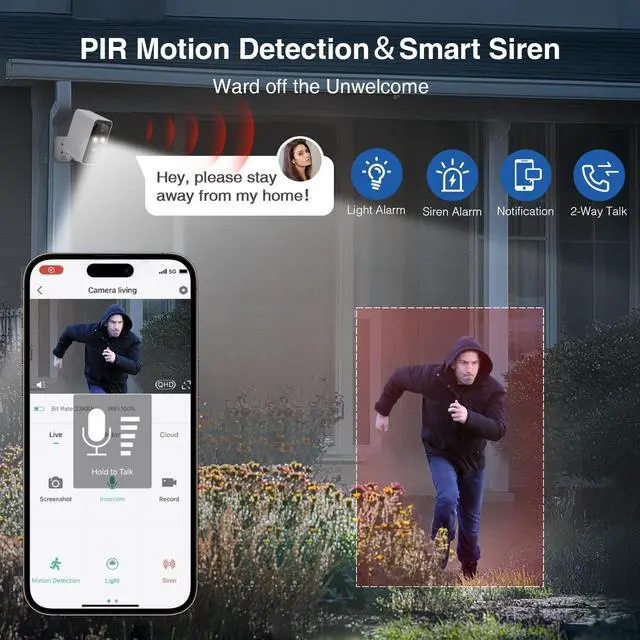 PIR Motion Detection & 2-Way TalkOur wireless security camera is equipped with PIR Motion Detection to identify and alert you of any movement. The 2-Way Talk feature allows you to communicate directly through your security cameras for home, offering real-time interaction with anyone near the camera. This surveillance cameras ensures you stay connected and informed, providing peace of mind whether you're at home or away.