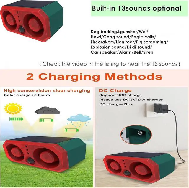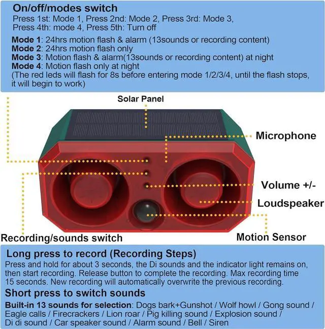 IP65 Waterproof,Outdoor Wide ApplicationThe solar alarm light housing is made of ABS high-strength plastic and has IP65 rating for dust and water resistance. It is suitable for houses, farms, barns, garages, courtyards, villas, hotels, factories, schools, orchards and other places that require security alarms. Sound and light alarms and custom recordings sound when animal activity is detected to scare off intruders and alert homeowners of animal break-ins.