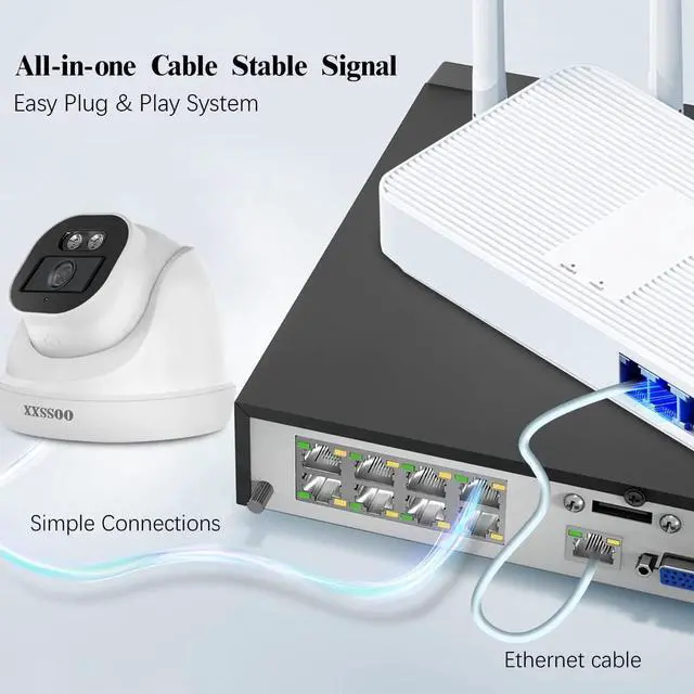 {Plug and Play PoE System} The camera kit comes with 60ft network cables, which allows for easy installation and set-up. After connecting the security cameras to the NVR ports, recording and live views can be seen within seconds via an HDMI monitor.