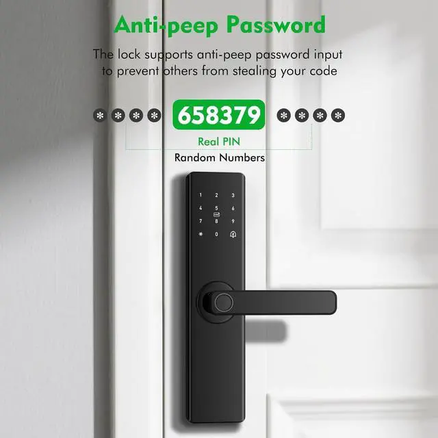 Anti-Peep Password - Enhance your privacy with our front doo locks anti-peep password featuresimply add random digits before or after your actual code to prevent others from guessing it. (Initial password: 123456). In the meantime, you can create temporary access codes via APP and granting or revoking entry at any time.How to add an administrator1.Wake up the screen. pressing * # 2.pressing original password 123456 # to set a NEW password.3.The system will enter the menu 4.pressing 1 Lock setting---- pressing 4 adding an administrator.)