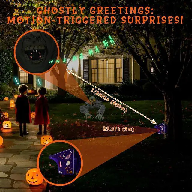 Rechargeable Base Station with Spooky Sound Effects: The rechargeable base station can be easily hidden inside Halloween decorations like pumpkins or cauldrons. The system plays spooky Halloween music when activated by the motion sensor, bringing an extra layer of excitement and surprise to your Halloween setup.