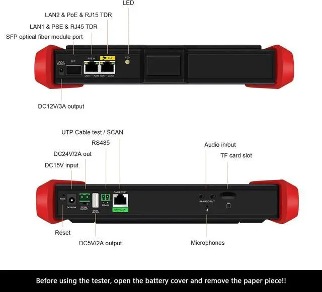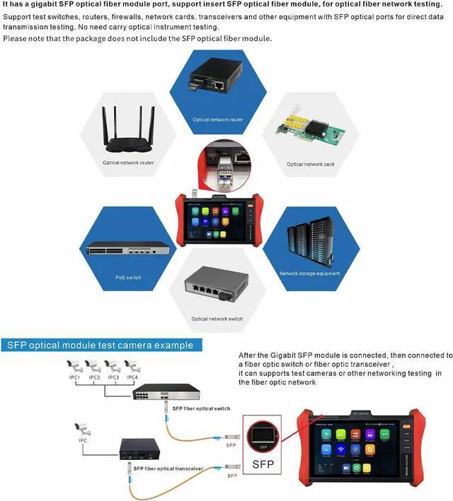 [ IP Camera Tester ] WANLUTECH IP camera tester with PoE, it support max 90W POE power output, temporarily powers the high-power PTZ camera or other devices supported by the IEEE 802.3af/at/bt standard protocol. DC15V power intput. It has 8 inches touch screen. Support IP Discovery/Quick OVIF/IPC test/Rapid Video, auto view the video, create testing report. It has a gigabit SFP optical fiber module port, support insert SFP optical fiber module, for optical fiber network testing