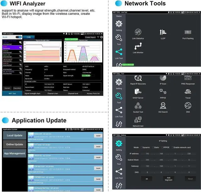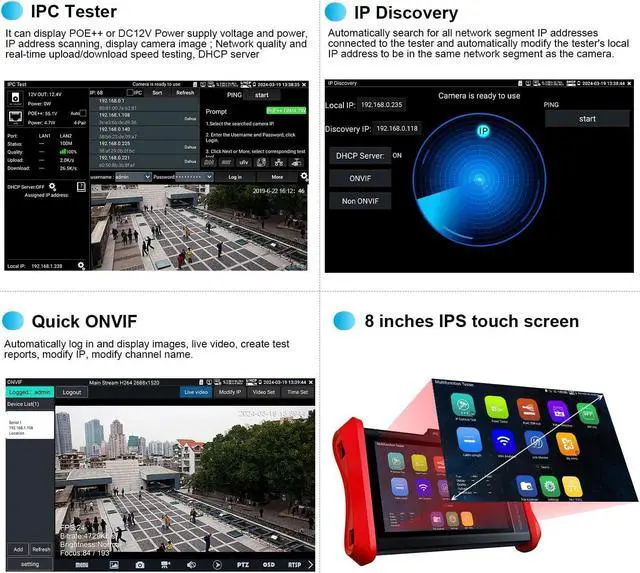 [ Camera Test Tools & Network Tools ] The IP camera tester supports batch activation of DH, Hik cameras and modification of IP addresses, passwords, support to self-defined modify channel name, factory reset, etc. Network Tools: Ping, IP scan, DHCP server, PPPOE, Trace Route, Port Flash, LLDP, Link Monitor