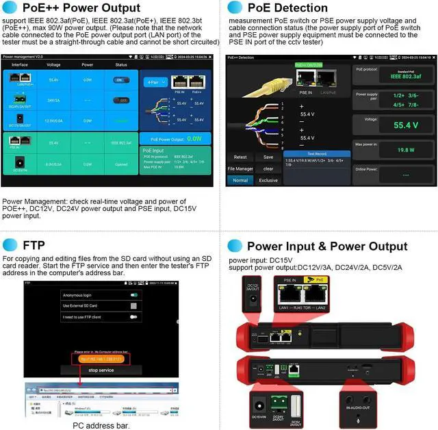 [ Multifunctional CCTV Camera Tester ] The OS of IPC tester is Android. WIFI Analyzer: support to analyse wifi signal strength,channel,channel level, support to create WI-FI hotspot. PoE Detection: measurement POE switch or PSE power supply voltage and cable connection status. Power Management: check real-time voltage and power of POE, DC12V, DC24V power output and PSE input, DC15V power input. Data monitor: Captures and analyzes the command data from controlling device, also can send hexadecimal. Power input:DC15V, Power output:DC12V/3A, DC24V/2A, DC5V/2A