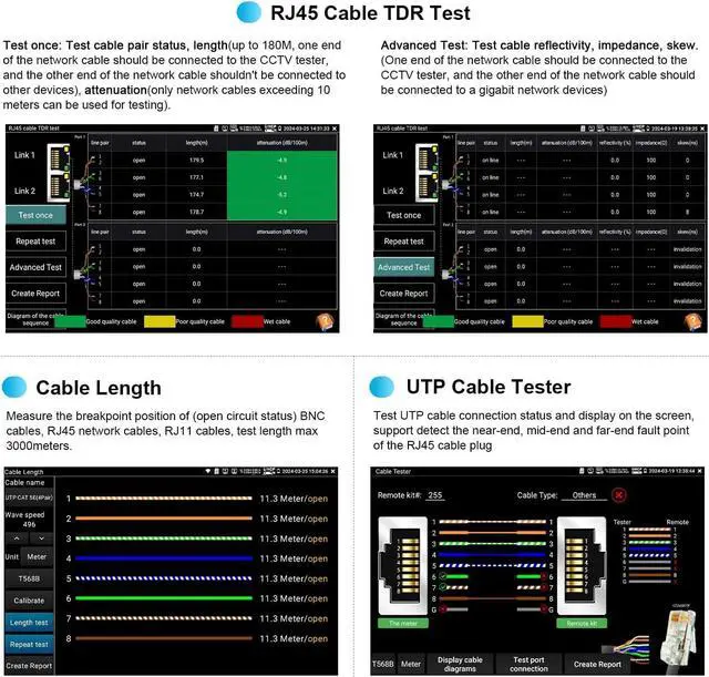 [ Cable Tester ] RJ45 Cable TDR Test: it can test cable pair status, length (up to 180 meters), attenuation(only network cables exceeding 10 meters can be used for testing), reflectivity, impedance, skew. UTP Cable Tester: test UTP cable connection status and display on the screen, support detect the near-end, mid-end and far-end fault point of the RJ45 cable plug. Cable Length Test: Measure the breakpoint position of (open circuit status) BNC cables, RJ45 network cables, RJ11 cables, test length max 3000 meters