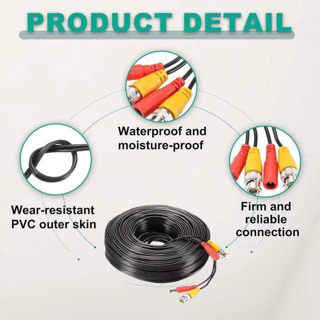 BNC video and power cable is made of thick copper,power supply and transmission integration,with low resistivity and strong conductivity, small attenuation, wear-resistant PVC outer skin, long service life, widely use,waterproof and moisture-proof, and fast transmission speed. Strong anti-interference, stable video signal transmission performance, thus minimizing interference and signal loss, durable connector, firm and reliable connection, easy installation, plug and play.