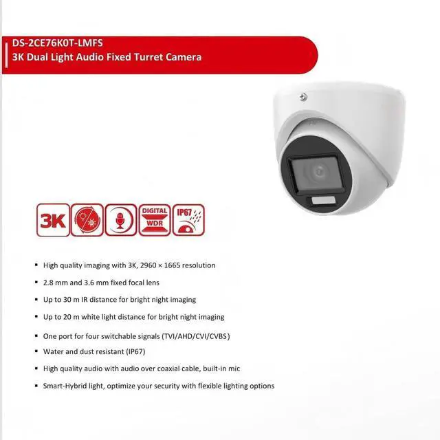 WEATHERPROOF IP67 RATING & BUILT-IN AUDIO Built to last outdoors with an IP67 certified housing that protects against dust, rain, and harsh weather conditions. It also features a built-in microphone and supports audio-over-coaxial cable, allowing you to see and hear everything clearly with simple, single-cable wiring.