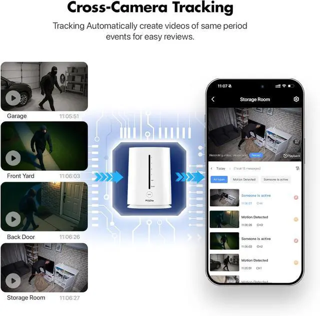 Cross-Camera Sync and Tracking: View live feeds from all four cameras simultaneously on your phone. Automatically track motion across security cameras and access synchronized event recordings for complete control and a unified home security system. You can customize activity zones for each security camera, set timer modes (Home/Away/Off), and view synchronized event timelines to relive events.