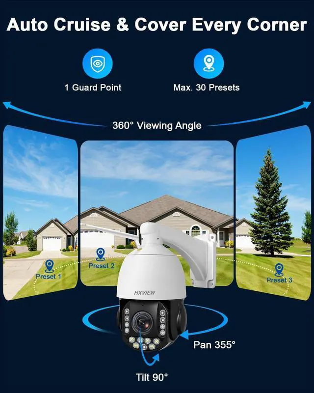 30x Optical Zoom Security Camera: With 30x optical zoom and autofocus lens, you can clearly see distant details without losing image quality. This PTZ camera outdoor is equipped with super ir lights that can achieve a night vision distance of up to 1,000 feet, providing clearer color reproduction and starlight-level night vision effects.