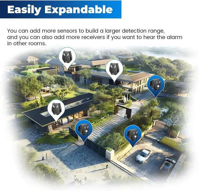 [Reliable & Expandable Sensor] Wite the solar panel, the sensor is equipped with a rechargeable battery for up to 24 months on a full charge! Easily adjust the sensors sensitivity to avoid interference like leaves or small animals, or expand your security zone with more sensors! the sensor can be used as motion activated barking dog alarm with 12 kinds of chimes (include Dog Barking&Gunshot Sound).