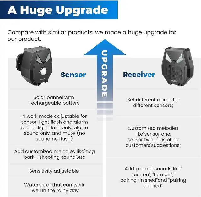 [New Upgraded] This driveway alarm system is the upgraded version with new technology. The sensor has 4 different work modes. Light and alarm sound can turn ON/OFF. The receiver has 16 kinds of chimes adjustable,you can set different chimes for different sensor with the new melody sound sensor 1,sensor 2....(these melodies was recommend by Wuloo customers for old version system).the volume of receiver is adjustable(4 levels include mute level). the volume of sensor can not be adjusted.