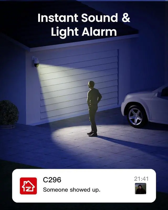 (4). [ Get Smarter Alerts that Matter ]__ The C296 PT PoE Camera offers enhanced AI detection, including face, person, vehicle, sound, pet, and package detection, which reduces false alarms from things like flying bugs or falling leaves. Customize specific areas for notifications, and activate sound and light alarms when motion is detected. The camera also sends email and push notifications directly to your mobile device for real-time alerts.