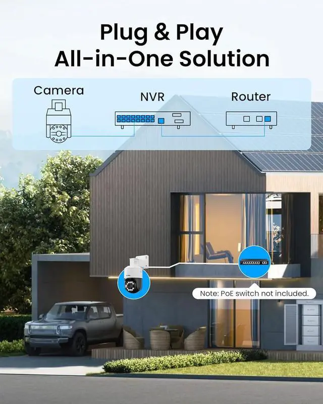 (3). [ Auto Motion Tracking with Wider Coverage ]__ Expand your security coverage with the cameras ability to rotate vertically up to 90° and horizontally up to 355°, eliminating blind spots. The intelligent motion tracking feature automatically follows moving targets, ensuring no important moments are missed. Note: The camera supports only 5X digital zoom. Humanoid tracking requires an NVR upgrade to version 2.0.8.