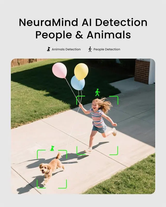 Subscription-free AI Detection & Storage Enjoy reliable security with built-in 8GB eMMC storage and NeuraMind On-Device Smart AI that differentiates people and pets. Get instant, accurate alerts without recurring costs or cloud fees (No SD Cards Needed).