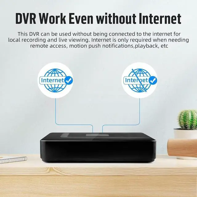 DVR Work Even without Internet The series DVR can be used individually or online applied as a part of a safety surveillance network. - The recording goes on with an HDD inserted in the DVR, even without the Internet. No WiFi Worries: Say goodbye to WiFi dependency! They don't connect to your network or the internet; long-range coverage without compromising your privacy.Internet is only required when needing remote access, playback, etc.