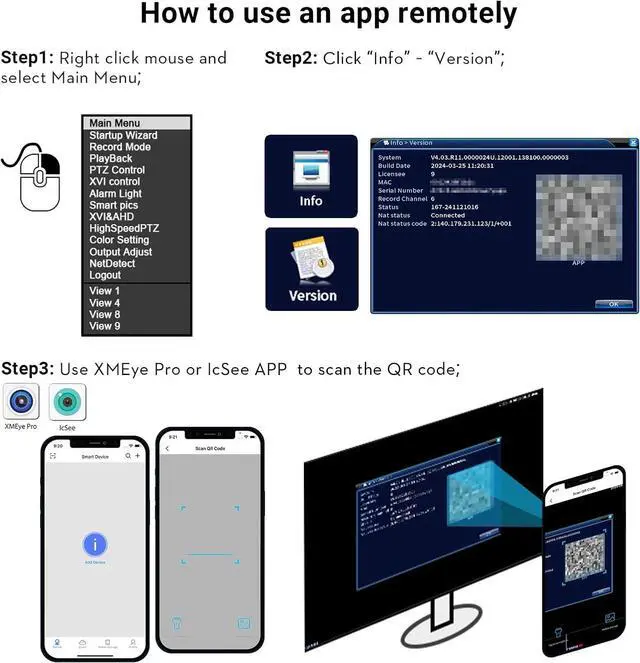 Instant AlertsThe system can detect anything unusual with the advanced algorithm and push real-time app notification and email alerts with snapshots, when there are motion events.Install download XMEye or lcseeView free mobile APP through scanning QR-code or download from APP store.With the free APP, You Can Remote View or via Smart Phones, Tablets, Notebook or PC. Access the system directly to see the motion-triggered events and take actions at once to prevent the intrusion.