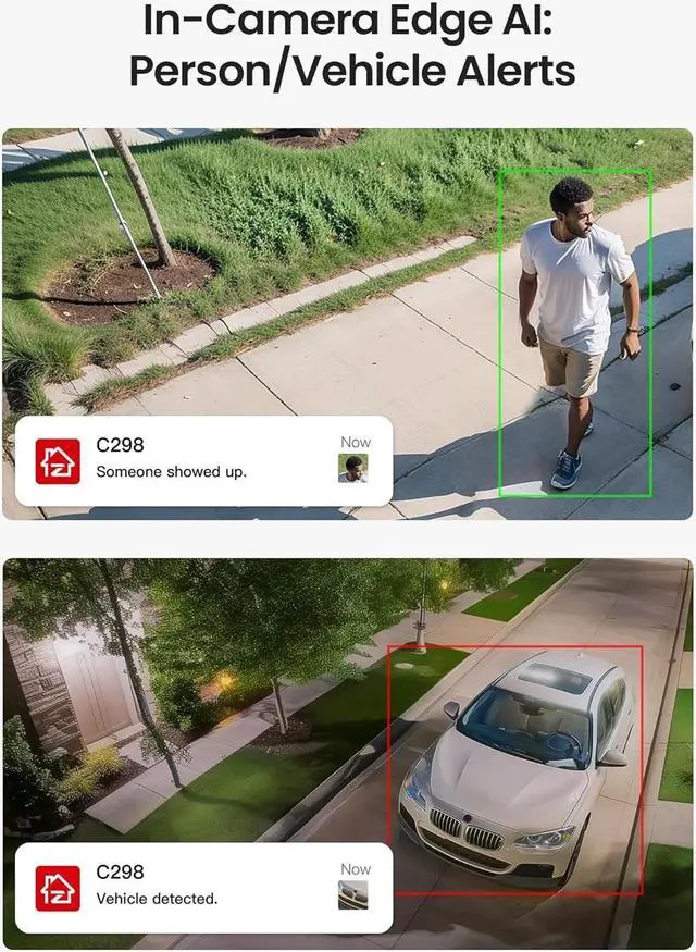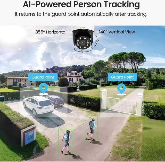 (2). [ AI Detection & Human Auto Tracking ]__ Using advanced AI, the ZOSI Dual-Lens Camera detects and distinguishes humans and vehicles, tracking them until they exit its view. It also supports customizable motion, area, sound, and pet/package detection. On detecting unusual activity, it activates a bright white light alarm and sends instant push notifications and email alerts with screenshots.