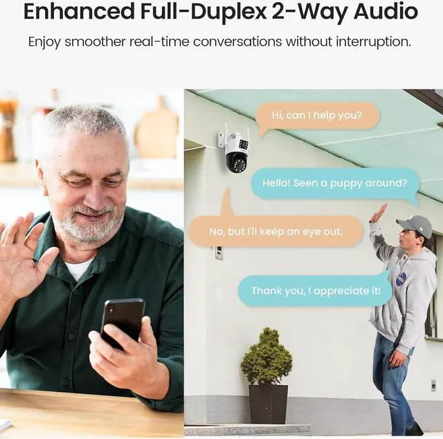 (3). [ Two-Way Audio & Customizable Voice Alerts ]__ Equipped with a built-in speaker and microphone, this camera allows real-time interaction with visitors or deters intruders remotely. Set custom monitoring zones and personalize voice alerts, such as welcoming guests or issuing warnings. Tailor the cameras responses to meet your security needs.