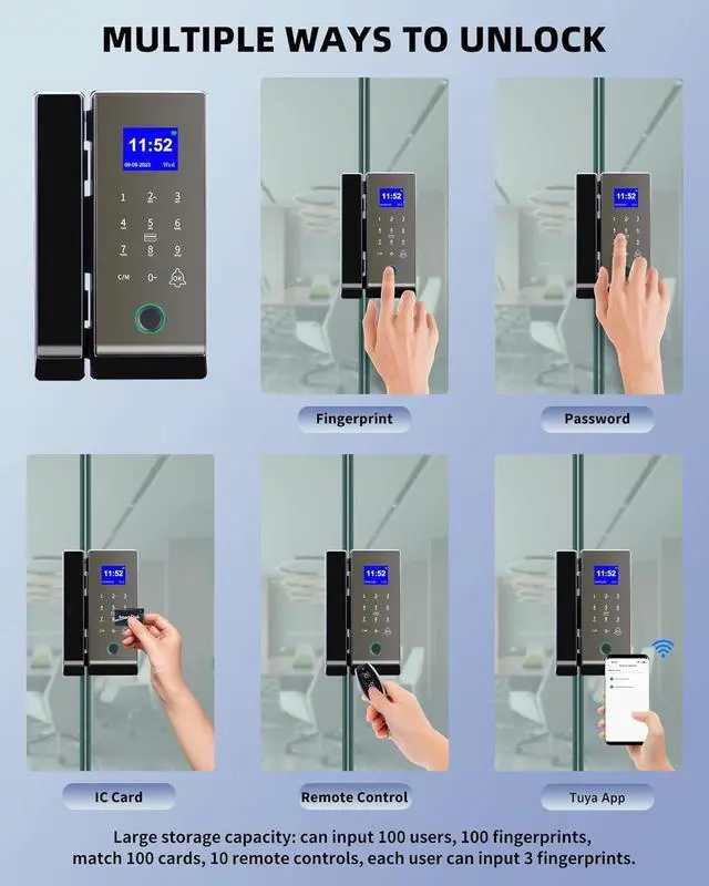 Key Advantages: Works for push-pull frameless glass doors/double acting frameless glass door. Our cutting-edge fingerprint recognition technology ensures lightning-fast and highly accurate sensing, surpassing industry standards. Extensive Storage Capacity: Store up to 100 users, 100 fingerprints, match 100 cards, and program 10 remotes. Each user can register three fingerprints.