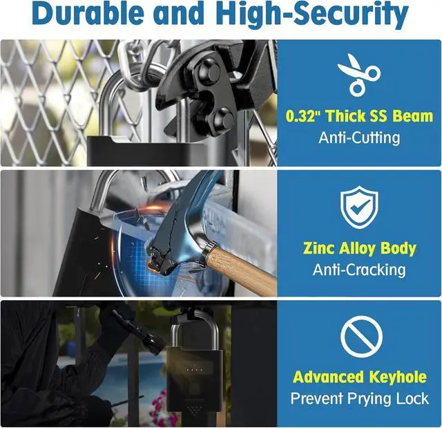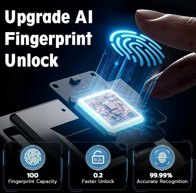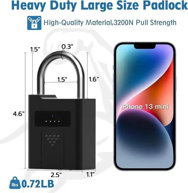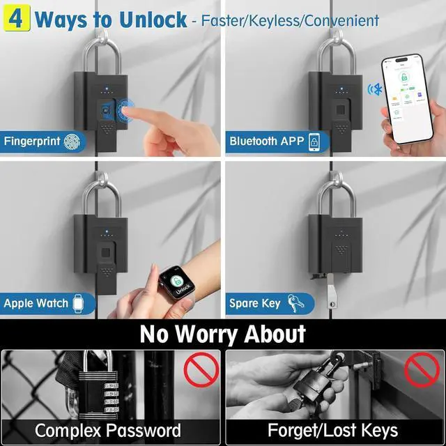 100 Fingerprints & 2 KeysYour finger is the key, do not worry about losing the key, Anti-theft, unable to copy keys. This smart padlock support 2 administrator and 98 normal users, 0.2 seconds speedily unlock.The fingerprint padlock comes with 2 keys for convenience!