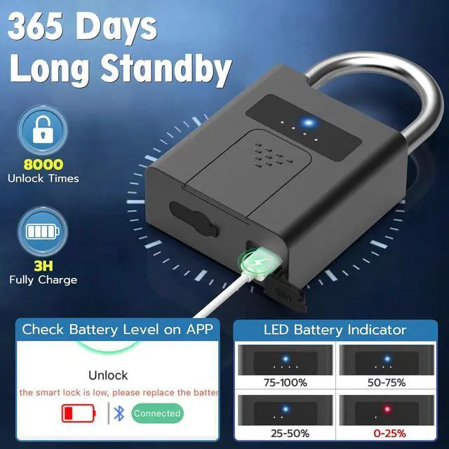 500mAh extreme running timeWaterproof Fingerprint padlock with battery indicator, low power consumption and long standby. The 500mAh lithium battery can support 24 months of standby time and can be unlocked more than 10000 times. When the battery is dead, the smart lock will remain locked, just charge it with a portable power bank by USB C cable.