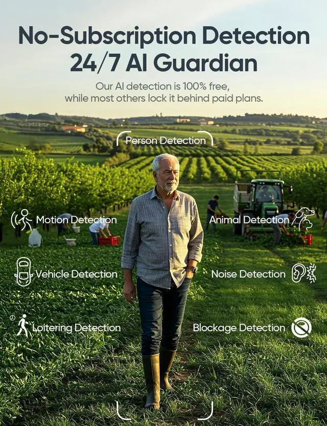 No Monthly Fee AI Tracking & Smart PatrolGo beyond basic detection: 360°auto-zoom (8x) on humans/vehicles + sound alerts (barks, car horns). Set 6-way patrol points for automated sweeps every 10 mins. Custom voice alarms + strobe lights deter intruders. Watch live feeds in real-time with manual zoom control