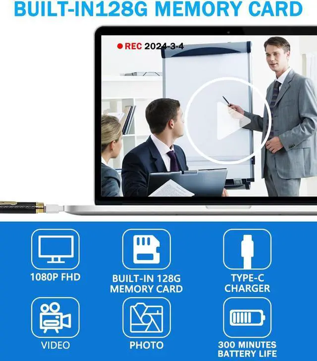 Built-in 128G memory Card: Featuring a built-in 128G memory, this portable security camera can store hours of footage, ensuring you won't miss any critical moments while using your hidden camera