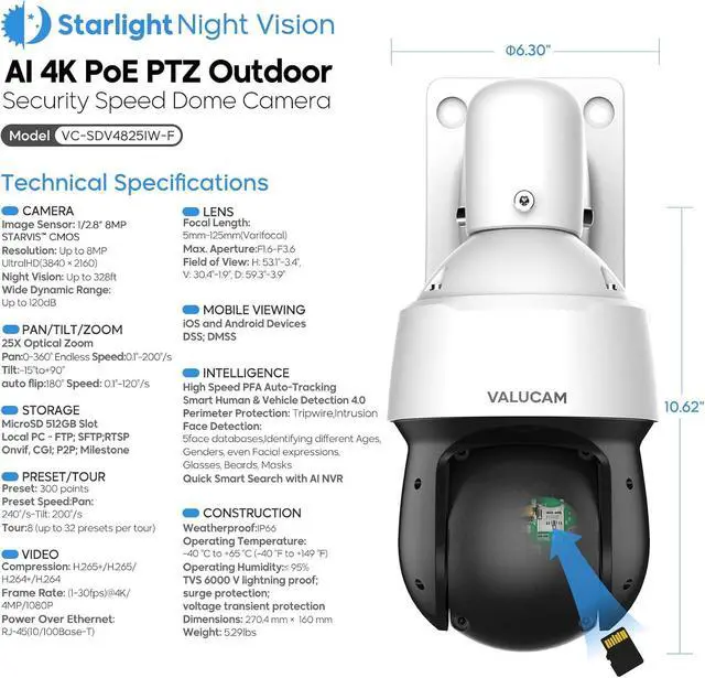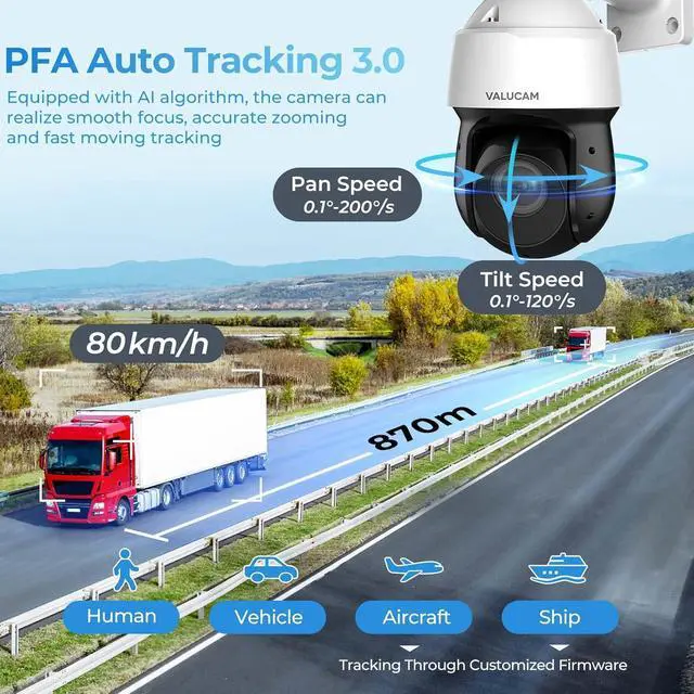 Smooth High Speed Auto Tracking3.0This outdoor PoE camera combines powerful PFA Technology, supports fast focusing, coupled with the high rotation speed (Pan: 240°/s, Tilt: 200°/s), easy cupturing 80km/h fast moving target. This IP66 Weatherproof PTZ camera guarantees exceptionally smooth video footage during tracking and zooming operations, even in harsh weather conditions, for extended periods of time. Experience unmatched fluidity as the camera effortlessly tracks and magnifies subjects of interest.