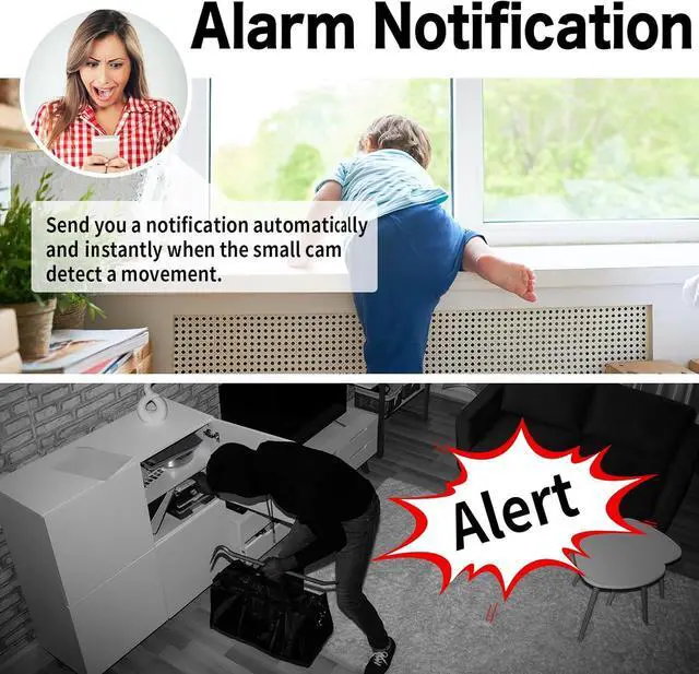 Motion Detection+Alarm Notification This mini security camera support Motion Detection Recording and Alert Notification Functions (compatible with Micro SD card up to 128GB, not include). It will start to record video and send you an alert notification automatically when the WiFi nanny cam hidden camera detect a motion.