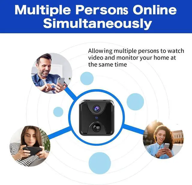 Multiple Persons Online Simultaneously+Multi-cameras Connection Allowing multiple persons to watch video and monitor your home at the same time, this mini pet camera/baby camera can be shared with your familly to monitor your home security. You can also connect and monitor multi cameras on the app simultaneously.