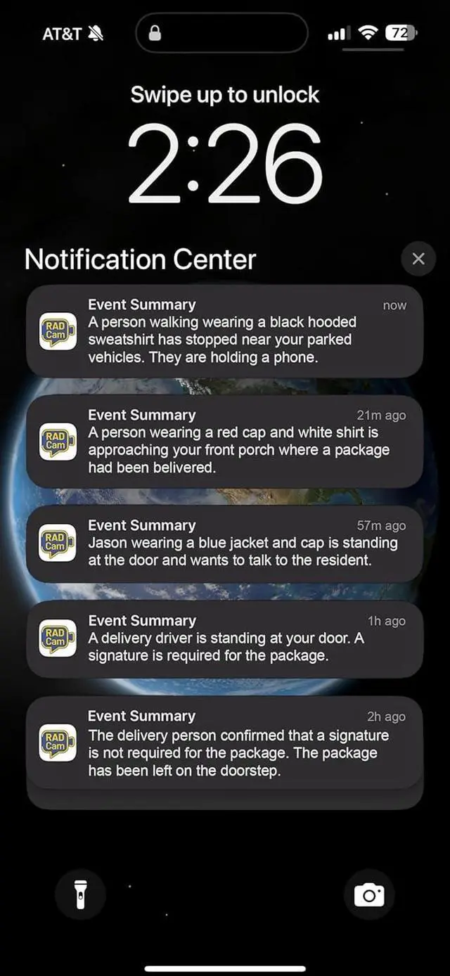 Intelligent Greeting & Visitor Identification: When a visitor approaches, RADCam uses AI facial recognition and clothing detection to greet them by name or describe them in detail. Notifications are sent to your phone with context like "Josh is here for dinner" or "A person in a black hoodie is at your front door," keeping you up to date in real-time.