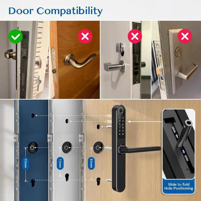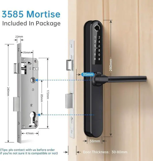 Mortise CompatibilityLuston slim door lock comes with 3585 mortise b (Upper center to lower center length is 85mm, center to door edge length is 35mm) in package by default. Please compare the size before you purchase. If your door mortise is other size, pls consult us before purchasing.