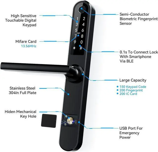 7-IN-1 Ways to Unlock Your Door1. Fingerprint 2. Smartphone Bluetooth APP Control 3. Passcode 4. Key Fobs 5. Mechanical Keys 6. Apple Watch 7. NFC (Android), and Alexa Voice Unlock(Wifi Gateway Required, sold separately). Never worry about being locked out again.