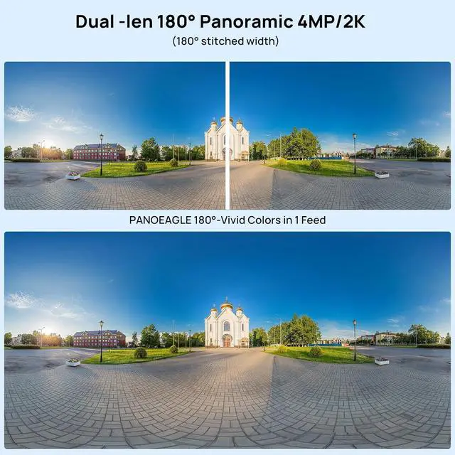 170° Panoramic View Security Camera This 4mp dual-lens security camera is equipped with built-in 2 × 1/2.9" progressive scan CMOS,2 × fixed focal 4mm lens and and F1.6 aperture that provides very wide view create 170° panoramic views with less distortion & fewer blind spots. 120 DB WDR technology will achieving better image in all lighting conditions. (TipsThis dual-lens camera is suitable for installation or debugging in large outdoor areas, and the distance is at least 4 meters, so that the monitoring picture will be clear. When testing the camera in a small indoor scene, the binocular monitoring screen will produce very obvious cracks, affecting the monitoring effect.)
