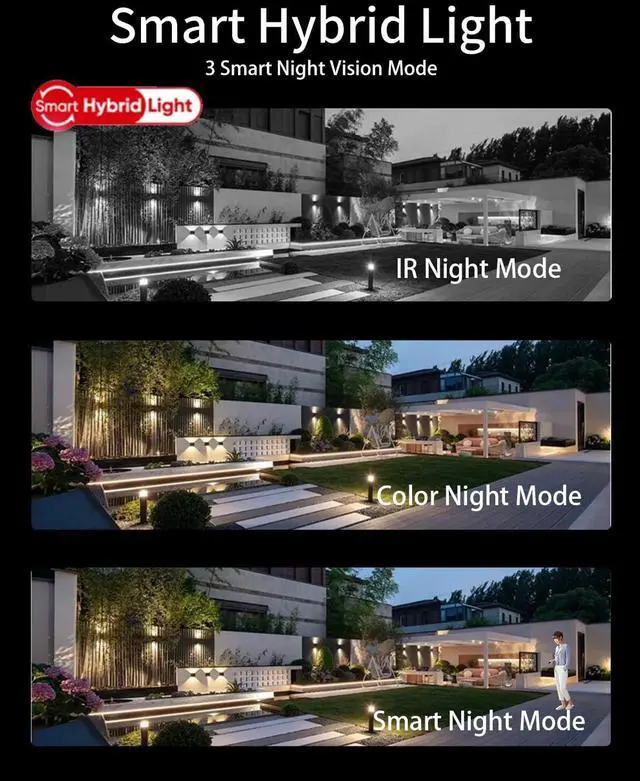 Experience three night vision modes with Smart Hybrid Light technology. Automatically switch to color vision when human motion is detected, or manually select infrared or white light modes. This flexibility ensures clear nighttime monitoring tailored to your specific security needs and preferences