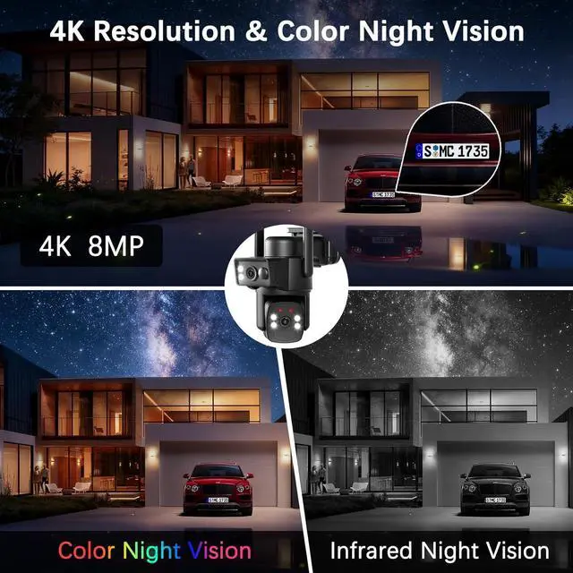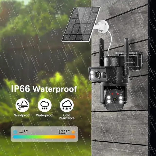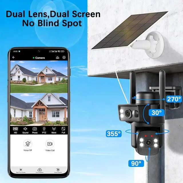 2-in-1 Dual-Lens & PTZ: Compared with other dual lens security cameras, this solar security cameras wireless outdoor is equipped with two rotatable lenses, dual view coverage, and all-round control of security area dynamics. The upper camera lock button area supports 30 degrees vertical(Manually adjusted). The lower rotating lens supports 355 ° horizontal+90 ° vertical rotation, allowing you to remotely rotate the camera angle in the application without blind spots.