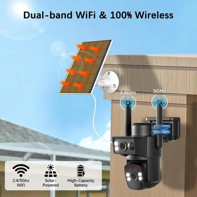 Dual Band WiFi & Solar/Battery Powered: Powered by solar energy and equipped with a large capacity battery, seamlessly switching power in rainy and cloudy weather, avoiding frequent removal of the camera for charging, and providing uninterrupted monitoring for 365 days. Supports 2.4GHz (wider signal range) and 5GHz (faster transmission speed) WiFi. The cameras for home security will automatically select the strongest signal network to ensure uninterrupted real-time streaming and fast alert notifications.
