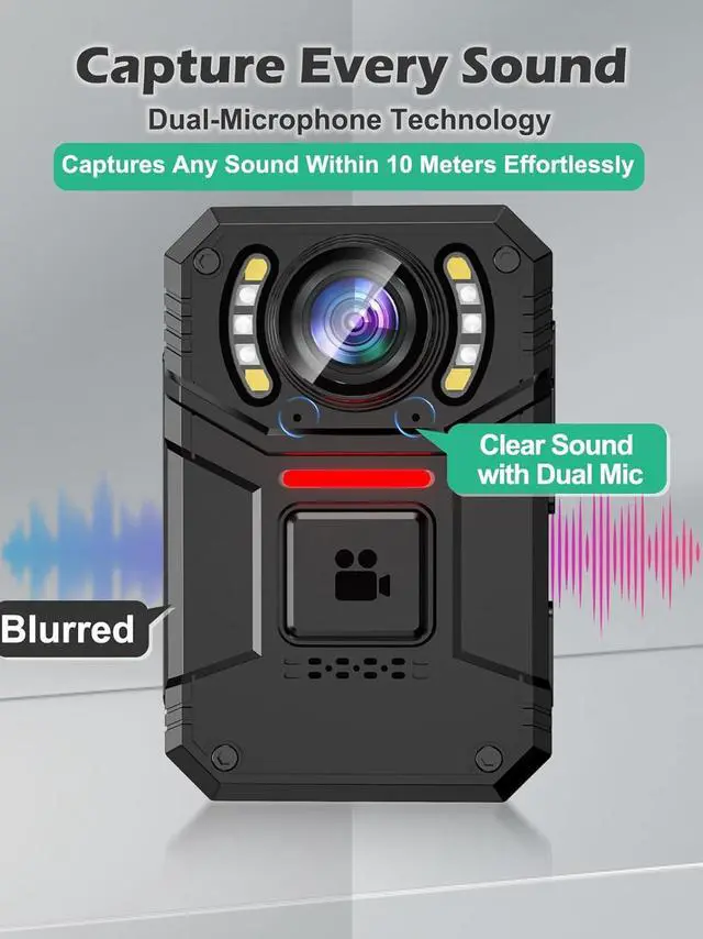 [Dual Microphones & AI Noise Reduction] This body cam with sound features dual high-sensitivity microphones(Most bodycams only have 1 mic) that can capture clear audio from up to 10 meters away. With AI noise reduction, background noise is filtered out, ensuring that your recordings are clear and focused, making this the perfect personal body camera for capturing important conversations in high-noise environments.(Noise Reduction Need to Turn on in The Menu)