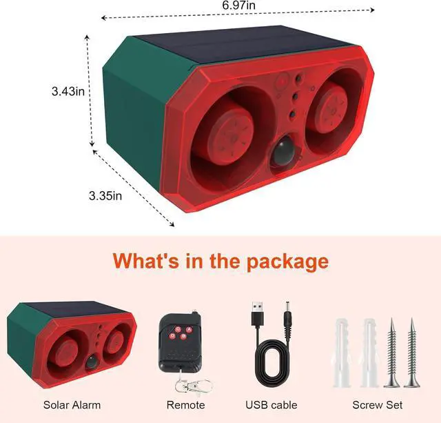 Say goodbye unwelcome animals from your garden:The solar alarm motion detector with sound utilizes 130dB loud sound and strobe light to drive out deer,bear or other animals.Motion Sensor Alarm Outdoor inchude 4 working mode, it's versatile for outdoor use, keeping your space free from unwanted intruders