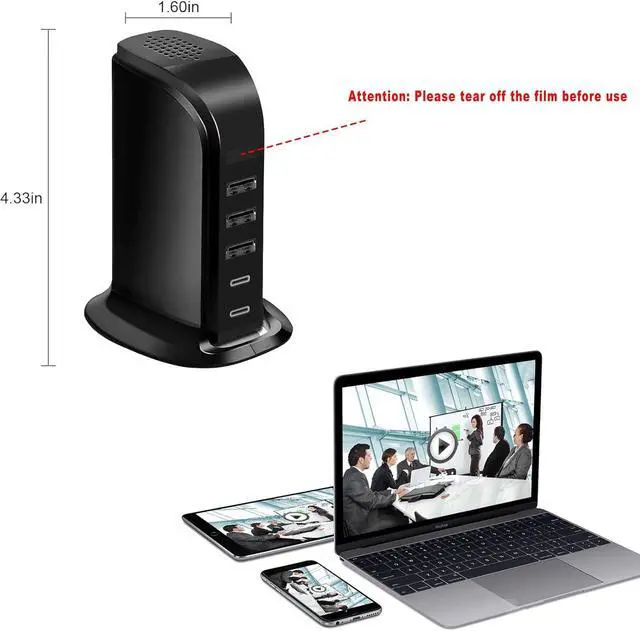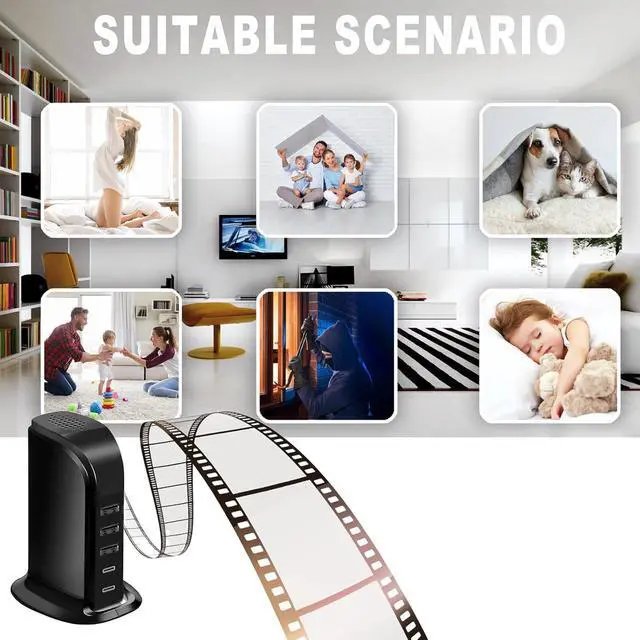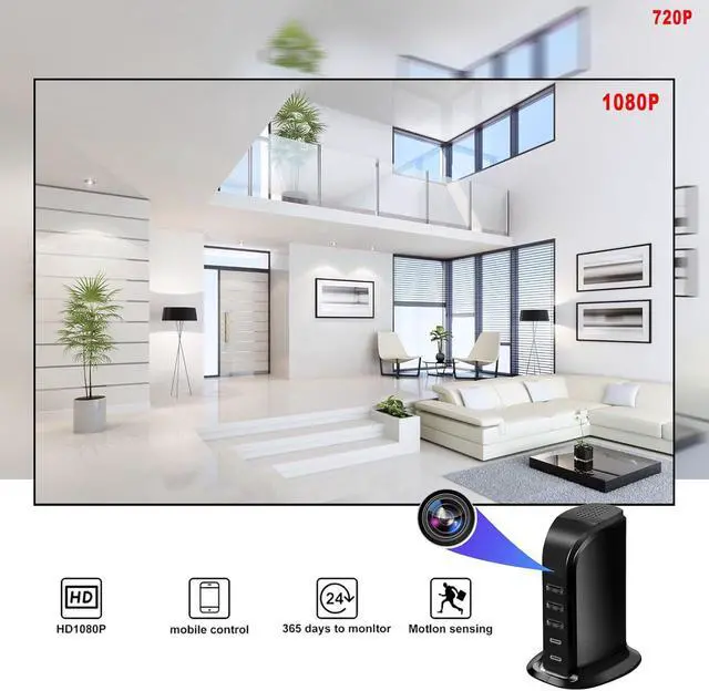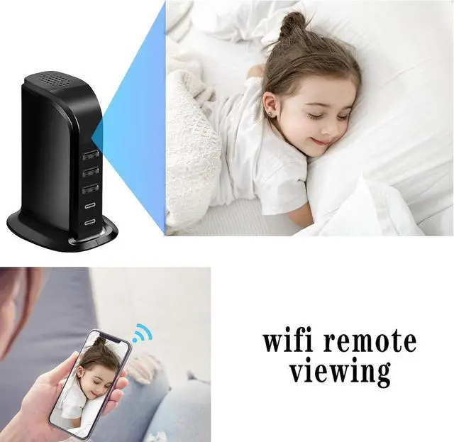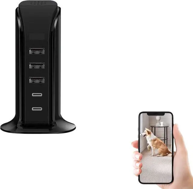 Dual-Power Hub & 1080p Camera: Combines a 5-port USB charging station with a full HD 1080p security camera power devices and monitor your space simultaneously.