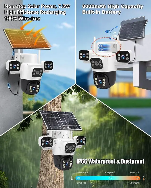 Non-stop Solar Power + 8000mAh Built-in Batteries: High efficient 7.5 watts solar panel enable to make the batteries full charged within 8-10 hours (Vary from weather and local environment); 8000mAh built-in batteries providing a long runtime deals with bad weathers at easy; Compact design and procision manufacture access to IP66 waterproof rate, protect the safety of using at outdoor.