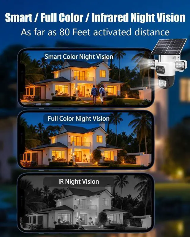 Designs to smart color / Full color / IR infrared night vision, smartly activates to its spotlight and infrared light, provide a much clear and full color night view even at deep black night as far as 80 feet, Light & Siren alarm and Two-way audio talk not only can deter the intruders, also is convenient to communicate with parcel carriers or visitors