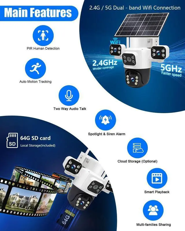 64G SD Card Local Storage (Included) ensures of 24/14 days continuously recording even no wifi connection, no subscription fee, double storage capacity and days than most of supply listings. Support cloud storage (optional, need subscription fee) for remote visiting, smart backplay and families sharing.